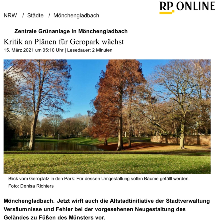 Ein Prüfstein, wohin zukünftig die Reise gehen soll, ist die Umgestaltung des Geroparks am Fuße des Münsters. Dieses Projekt muss bis Ende 2022 abgeschlossen sein. Noch vor einem Jahr schien diese Umgestaltung am Verlust der Parkplätze zu scheitern. Nun ist Dank der Zuschüsse des Landes die Umgestaltung beschlossen. Einige Parkplätze bleiben erhalten. Über die Details ist noch wenig bekannt. Die BürgerInnen sollen demnächst ihre Ideen einbringen. Das wird Ihnen aber nicht leicht gemacht.