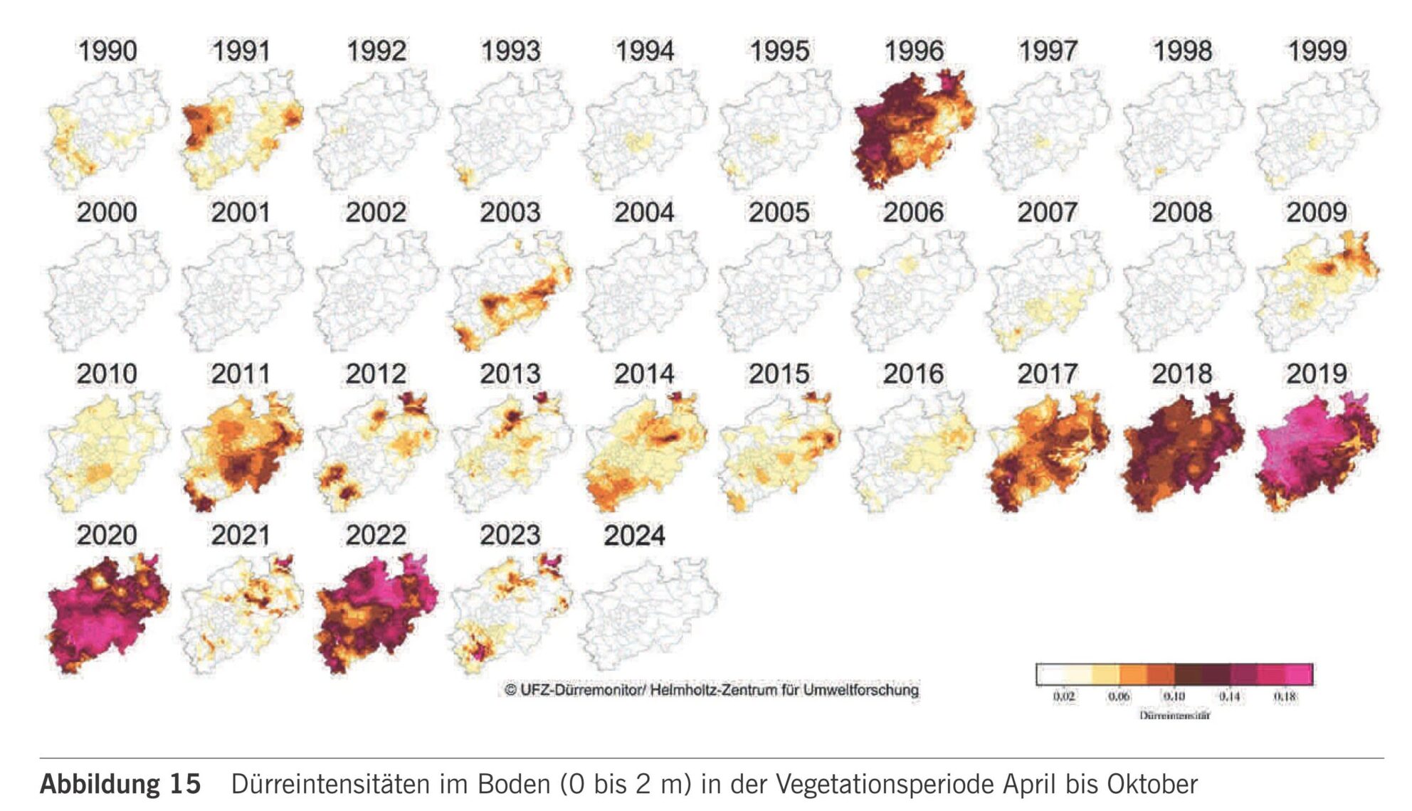 Dieser Trend, der dem anthropogenen Klimawandel geschuldet ist, wird von den Auswirkungen der Sümpfungen am Braunkohletagebau überlagert, der allerdings nicht das gesamte Untersuchungsgebiet betrifft.