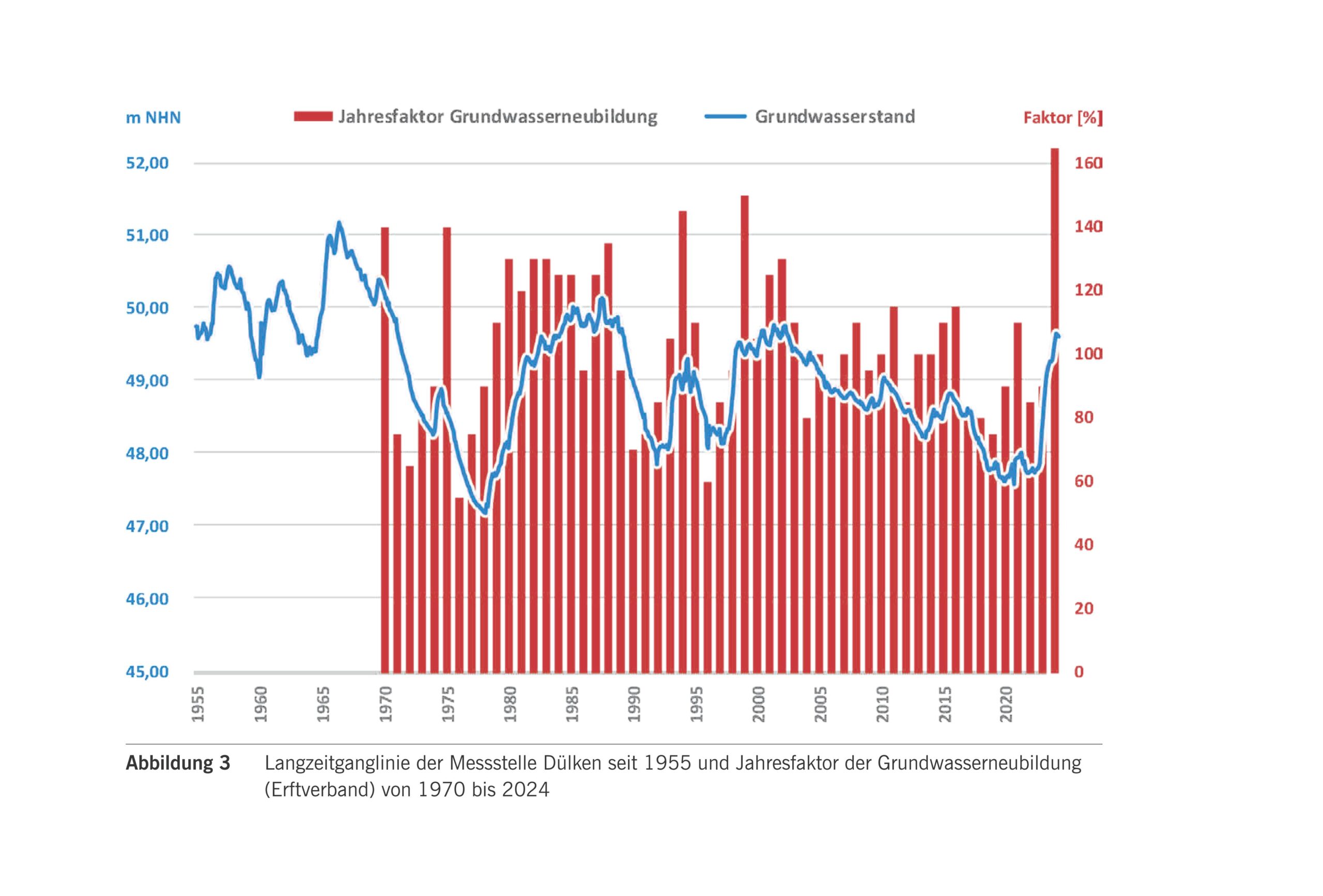 “Es zeigt sich, dass die höchsten bislang beobachteten Grundwasserstände Ende der 1960er-Jahre auftraten und in dieser Höhe eitdem nicht mehr erreicht wurden. Die ebenfalls hohen Grundwasserstände der 1980er-Jahre korrelieren mit der hohen rundwasserneubildung in dieser Periode. Seit dem Jahr 2003 bleiben Grundwasserneubildung und Grundwasserstände fast kontinuierlich unter dem langjährigen Mittel.”