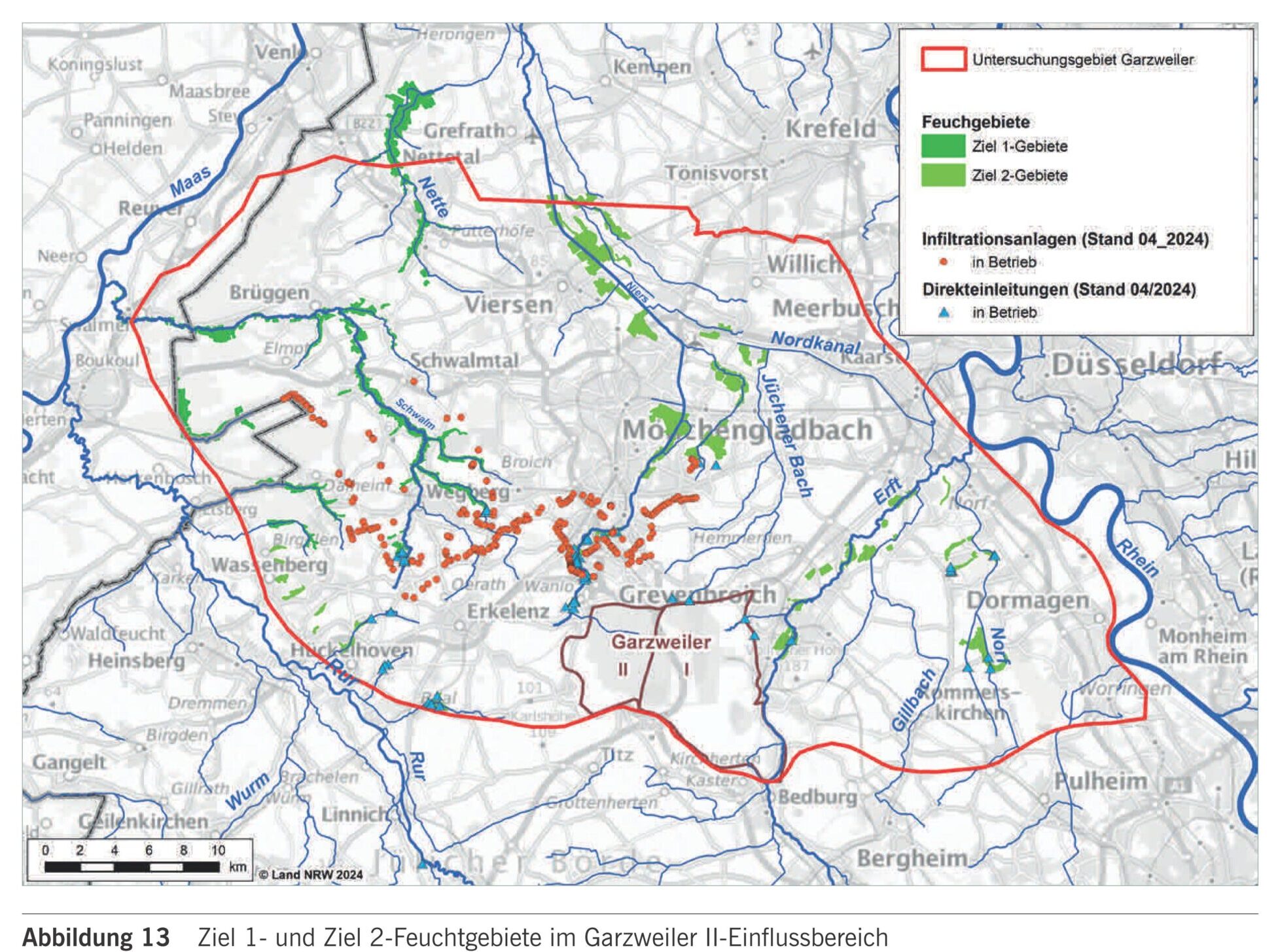 Am Güdderather Bruch besteht wegen der besonderen geologischen Situation eine hydraulische Verbindung zwischen dem obersten und dem tieferen Grundwasserstockwerk. Deshalb tritt hier ebenfalls Sümpfungseinfluss auf. Auch hier reduzieren oberflächennahe Einleitungen die negativen Auswirkungen der Grundwasserabsenkung. In einem Teilbereich gelingt es bisher trotz gezielter Grundwasseranreicherung nicht, die Grundwasserabsenkung zu kompensieren, obwohl hier mehrfach zusätzliche Anlagen errichtet wurden. Allerdings befand sich in diesem Abschnitt auch schon vor Auftreten der Absenkung keine feuchtgebietstypische Vegetation, so dass Schäden nicht zu befürchten sind, solange nicht weitere Flächen unter Sümpfungseinfluss geraten. Diese Absenkung ist in geringem Umfang auch noch westlich der Bahnlinie im Wetscheweller Bruch anzutreffen. Hier war im Frühjahr 2023 eine Infiltrationsanlage hinzugebaut worden, so dass die gesamte Infiltrationsleistung am Güdderather Bruch etwas gesteigert werden konnte.”“Die Gebiete Finkenberger Bruch, Stadt Mönchengladbach und Scherresbruch, Kreis Heinsberg werden seit dem Jahr 2021 negativ (rot) bewertet. Ein weiterer Ausbau der Wassereinleitungen und -verteilungen scheint in beiden Gebieten angesichts des abgesenkten Grundwassers nicht mehr zielführend zu sein. Deshalb wird der Bezirksregierung Arnsberg, Abteilung Bergbau und Energie empfohlen, Ausgleichs- und Ersatzverfahren für diese beiden Gebiete einzuleiten. Das Feuchtgebiet Finkenberger Bruch wird im Jahr 2024 von der RWE Power AG erneut auf Reste kleinflächig verbreiteter Feuchtwaldvegetation überprüft.”