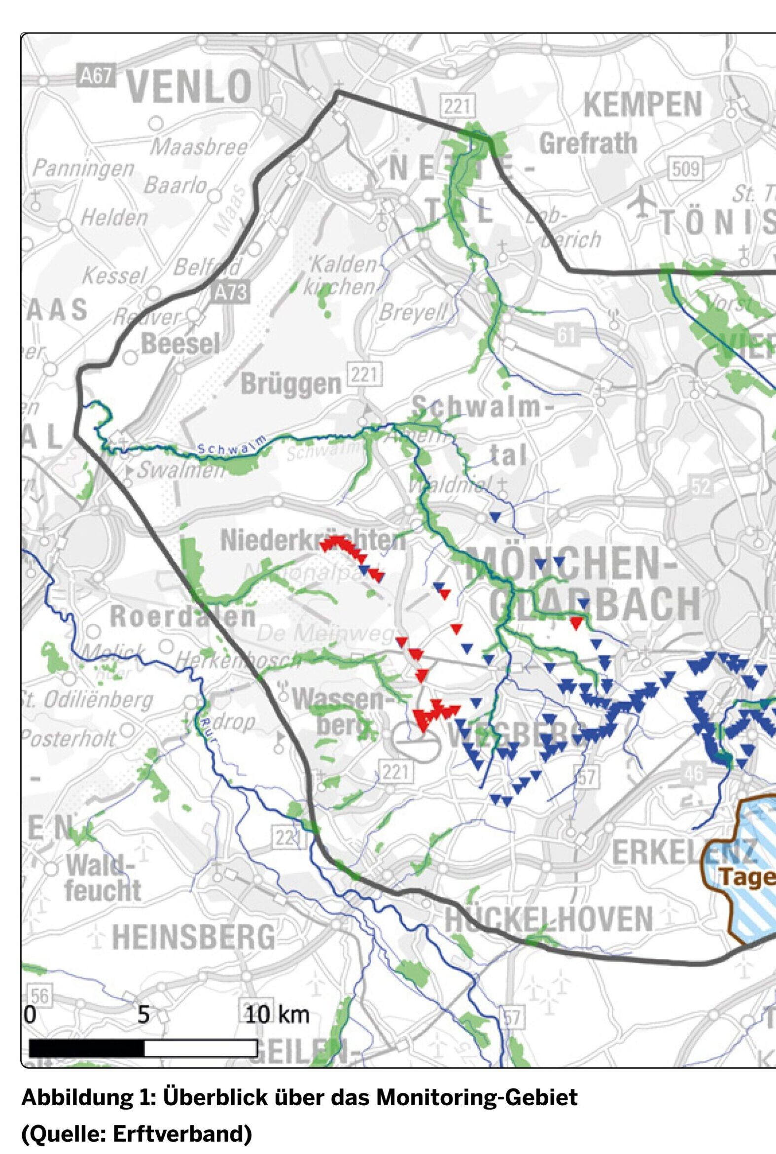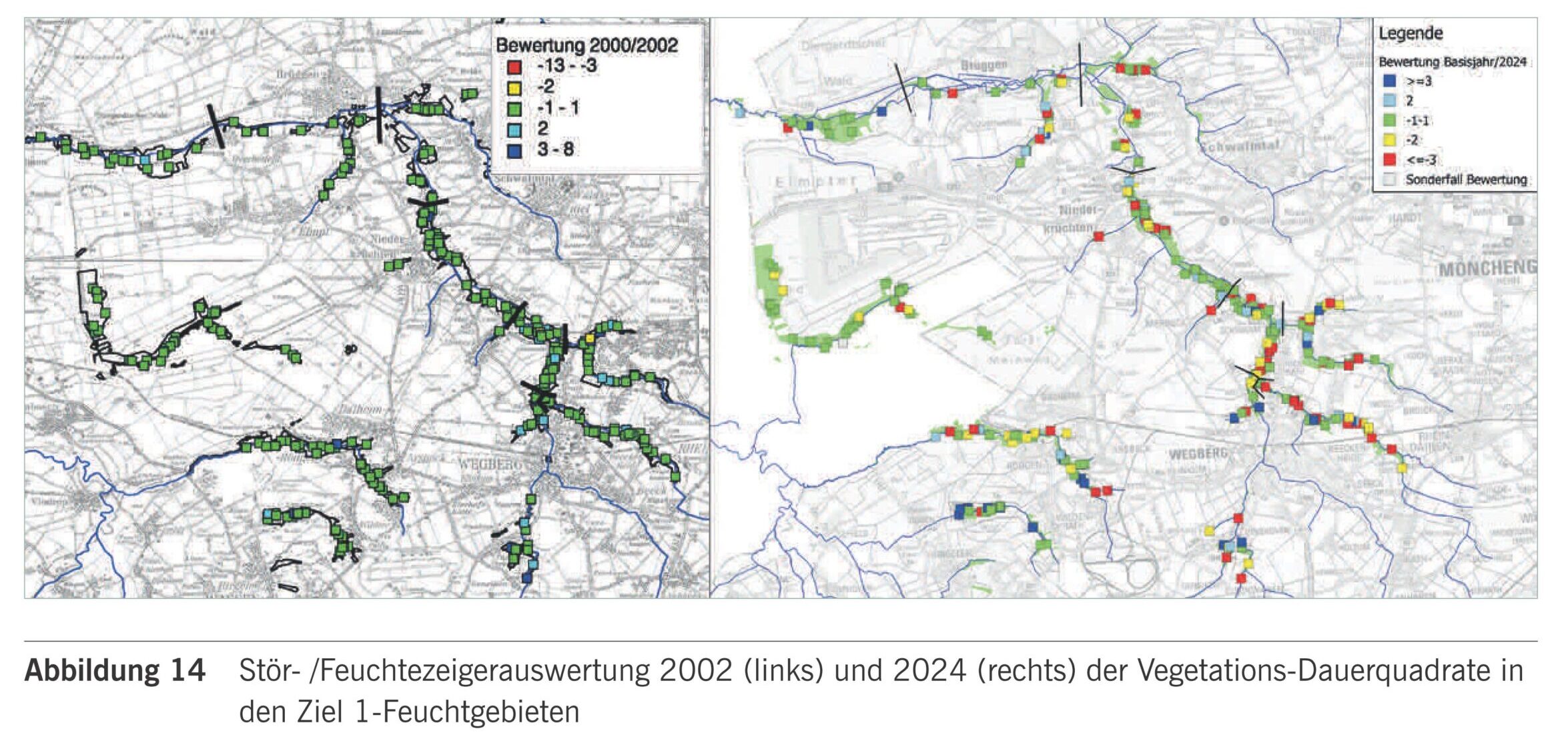 Da sich Sümpfungseinfluss und klimbedingte Nierschlagsderfizite vor allem in der Vegetationsperode überlagern, gelingt das an den Feuchtbeiten der Niers im Süden Mönchengladbachs schlechter als an den FFH-Gebieten im Westen der Stadt (Knippertz- und Hellbach sowie Mühlenbach). Aber auch dort lässt sich anhand der Kartierung von Indikatorarten, die auf Verschlechterung der Wasserverhältnisse empfindlich reagieren (Torfmoos Sphagnum spec.), eine negative Tendenz feststellen.