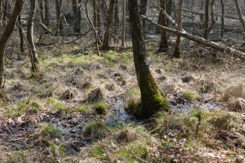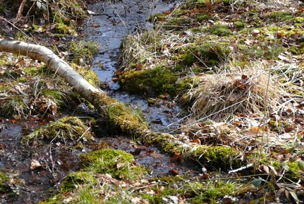 Dann wird es durch die zahlreichen Quellaustritte an der Oberkante des Tons nass und die Vegetation wechselt schlagartig zu einer Sumpf- und Quellflur mit auffälligen Torfmoospolstern.