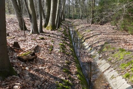 Hier liegen dann auch die ersten Schichtquellen, die den Bach von da an begleiten und mit Sickerwasser aus der 3-4 m mächtigen Kies-/Sand der höher gelegenen jüngeren Hauptterrasse der Venloer Scholle auf Viersener Gebiet speisen.