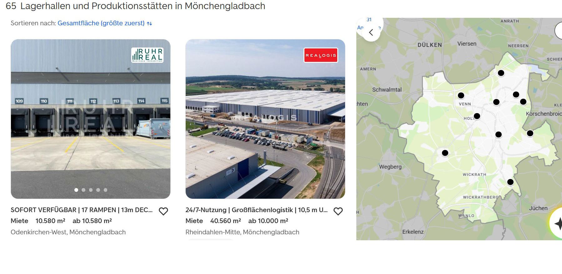 65 Lagerhallen und Produktionsstätten in Mönchengladbach mit mehr als 10.000 qm suchen Nachmieter (IS 24, Stand: 2.1.2026)