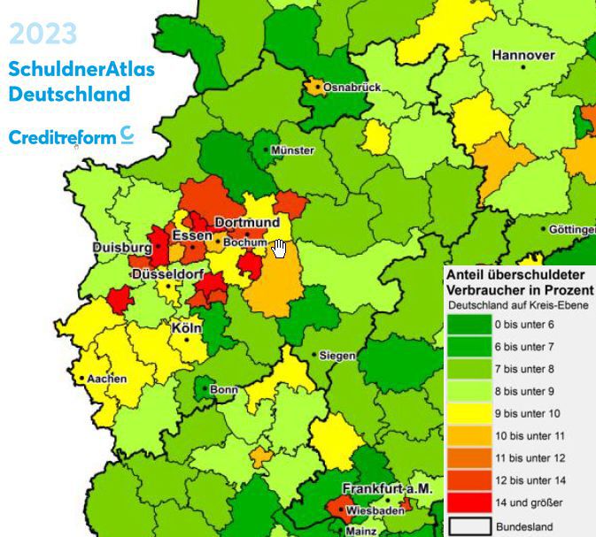 Auch in Mönchengladbach hat sich die Haushaltslage trotz zahlreicher neuer Gewerbegebiete nicht verbessert. Ende 2023 lag die Gesamtverschuldung bei 765 Mio. Euro, die Pro-Kopf-Verschuldung bei 2.551 Euro. Gleichzeitig gehört die Stadt zu den Kommunen mit besonders hoher privater Überschuldung: 14,15 % der Einwohner gelten als überschuldet, die durchschnittliche private Haushaltsschuld liegt bei rund 35.000 Euro.