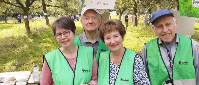 Äpfel selbst ernen, dann direkt pressen lassen für 5 L eigenen Saft. Apfelsortenbestimmung, Pflegemaßnahmen an Obstbäumen, Verkauf von Obstgehölzen alter und regionaler Sorten, Honigverkauf, Vorstellung von Wildtierpräparaten und vieles mehr. Die BUND-Aktiven Heinz, Alfred, Astrid und Harald präsentierten von 10.00 bis 17.00 die Themen Wildfrüchte, Fledermäuse, Freiflächenverbrauch in MG uvm.